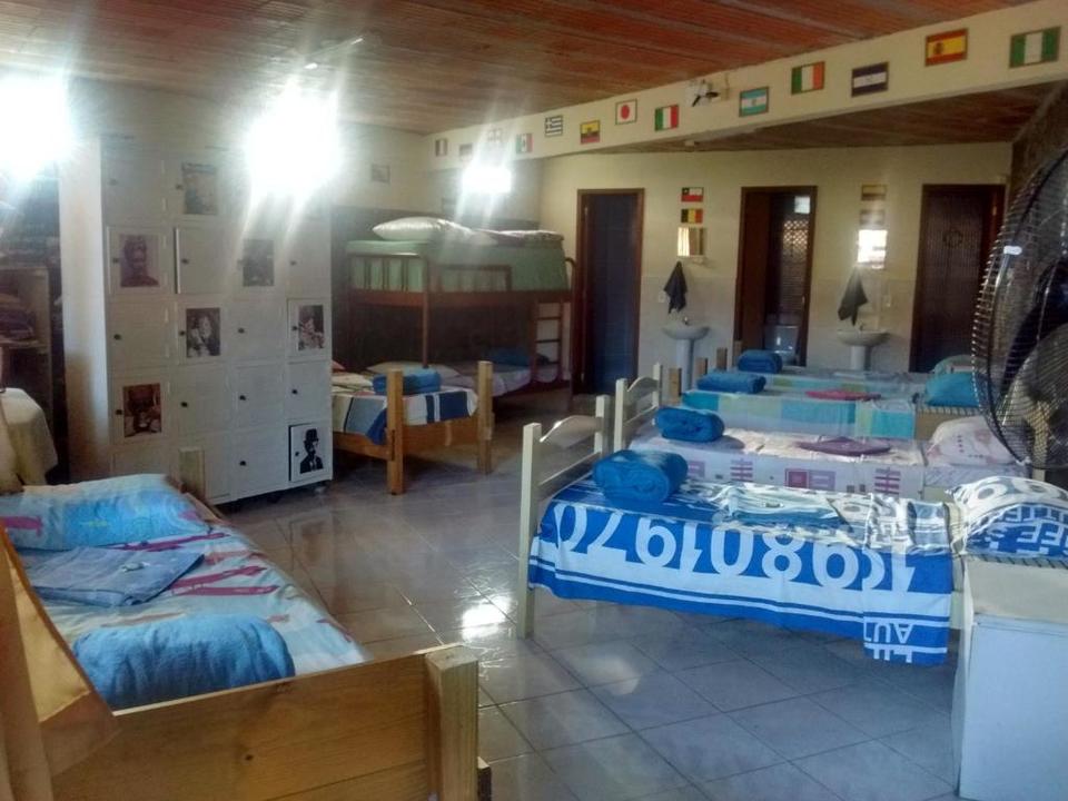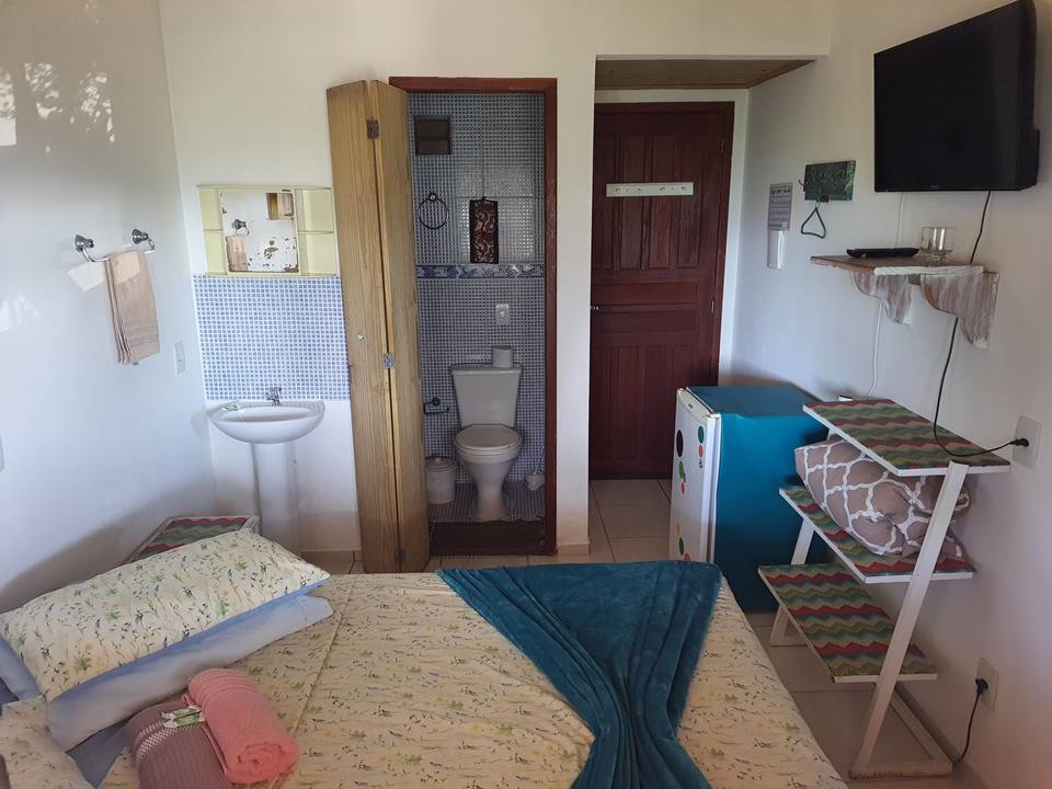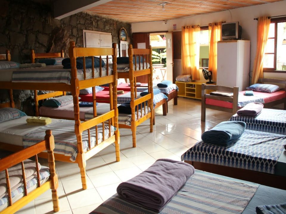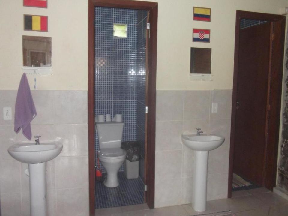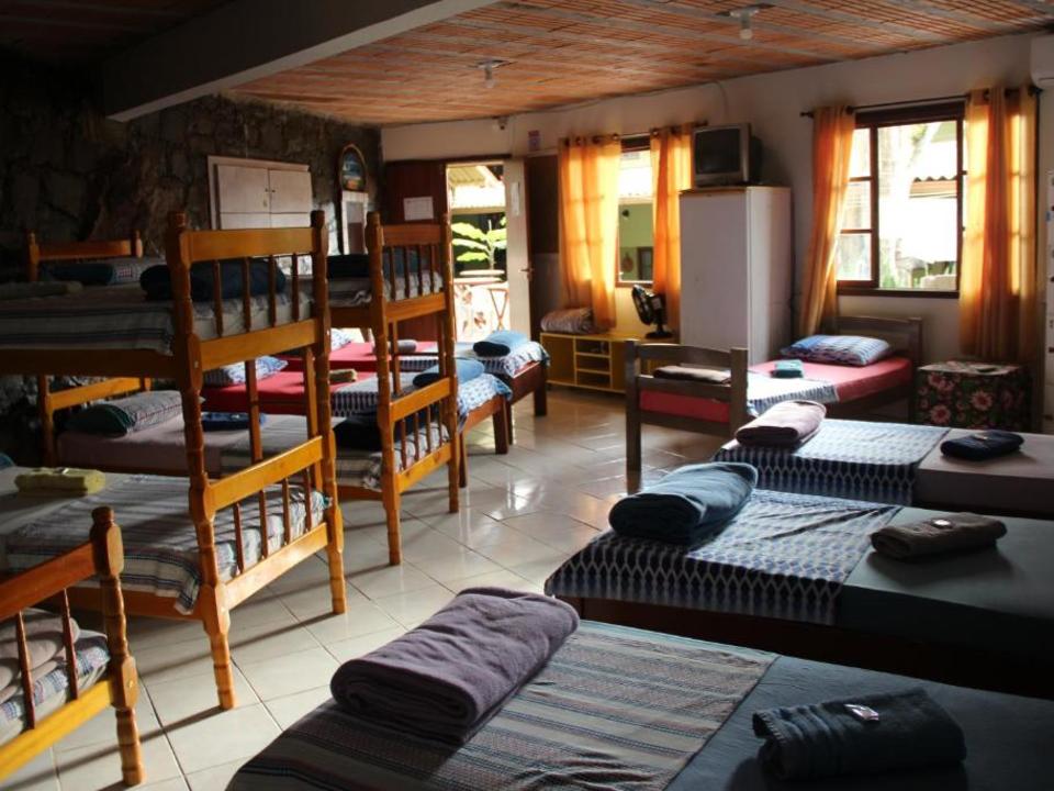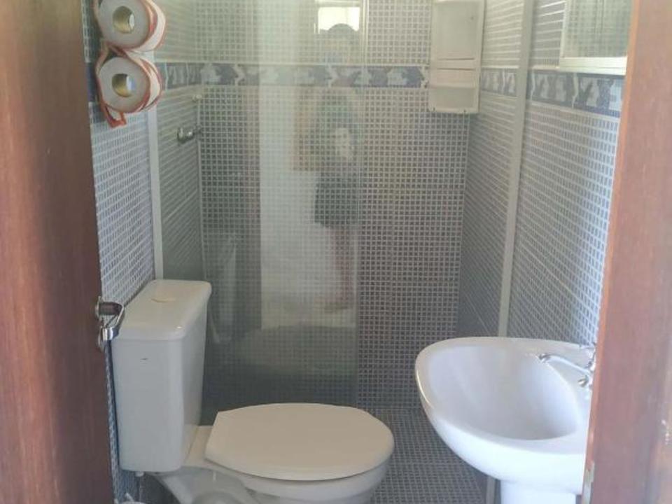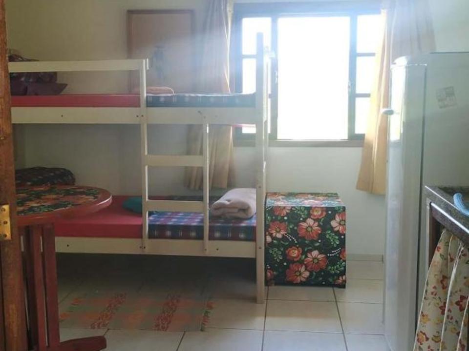 Amplo quarto compartilhado com até 12 pessoas. Com 3 sanitários e 2 chuveiros, Ar condicionado, geladeira e armários com chave. Ao lado de uma cozinha basicamente equipada com fogão e churrasqueira.