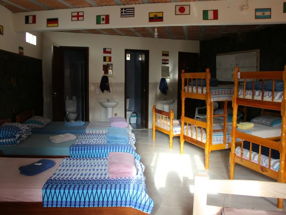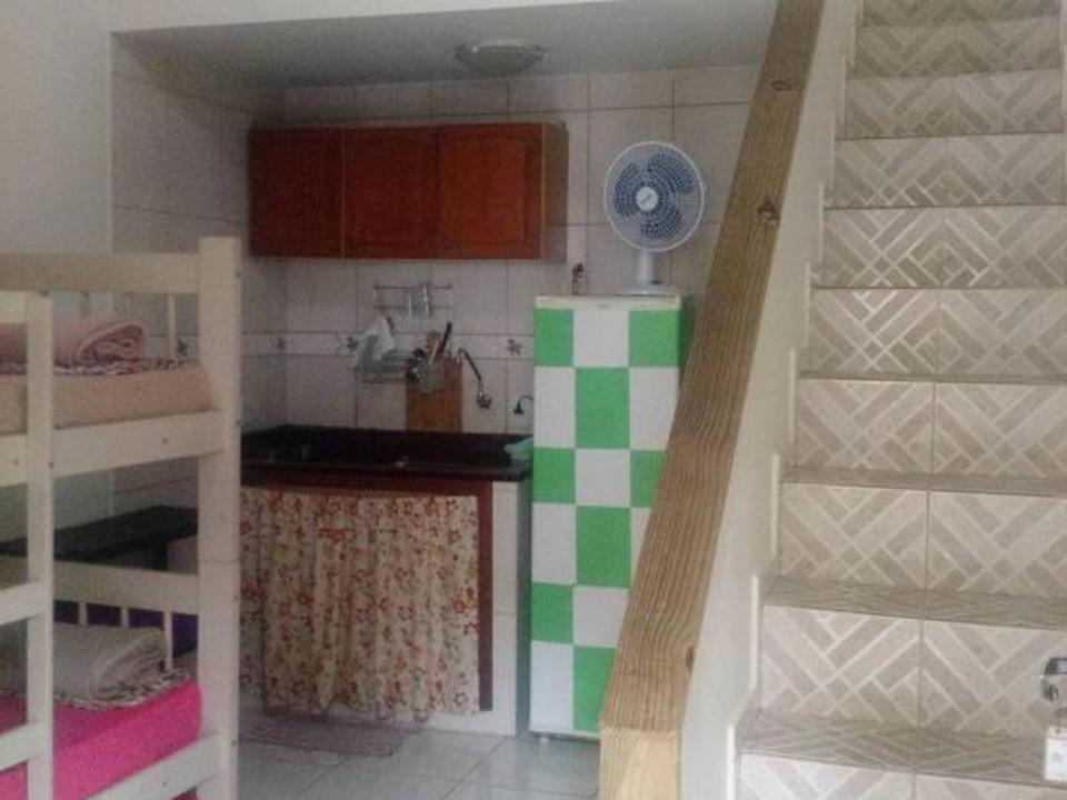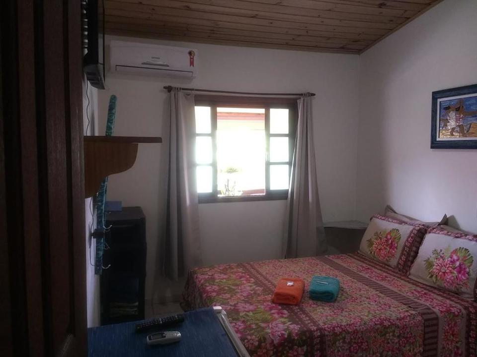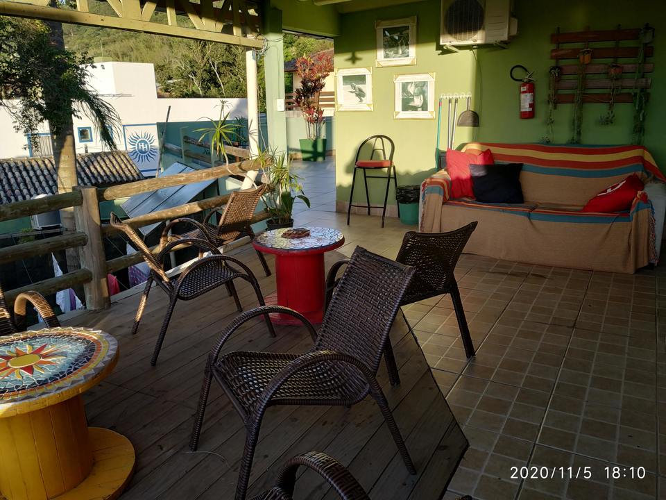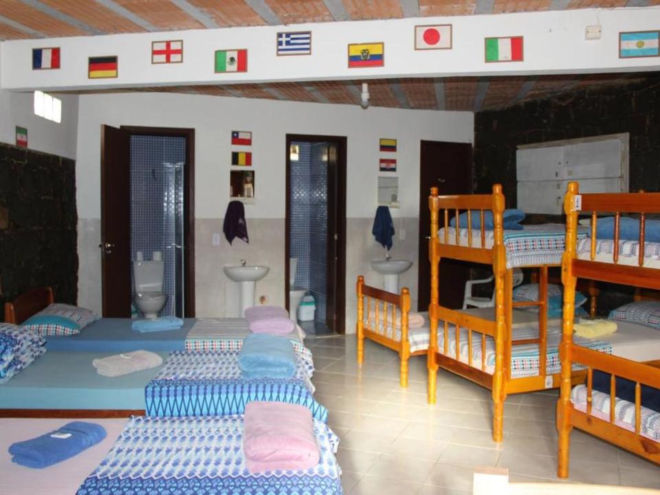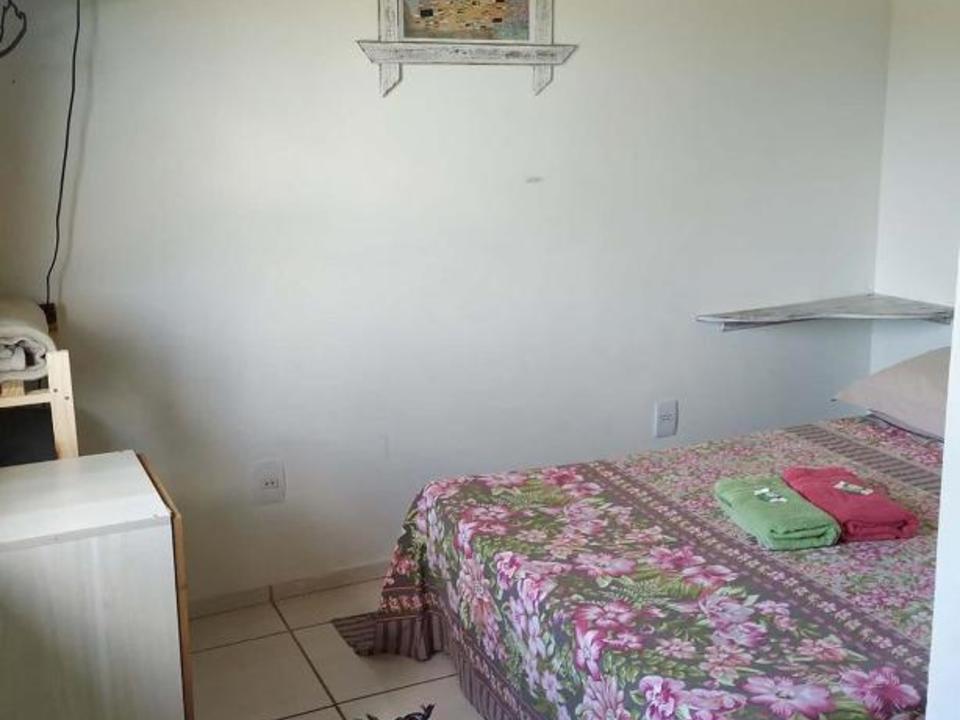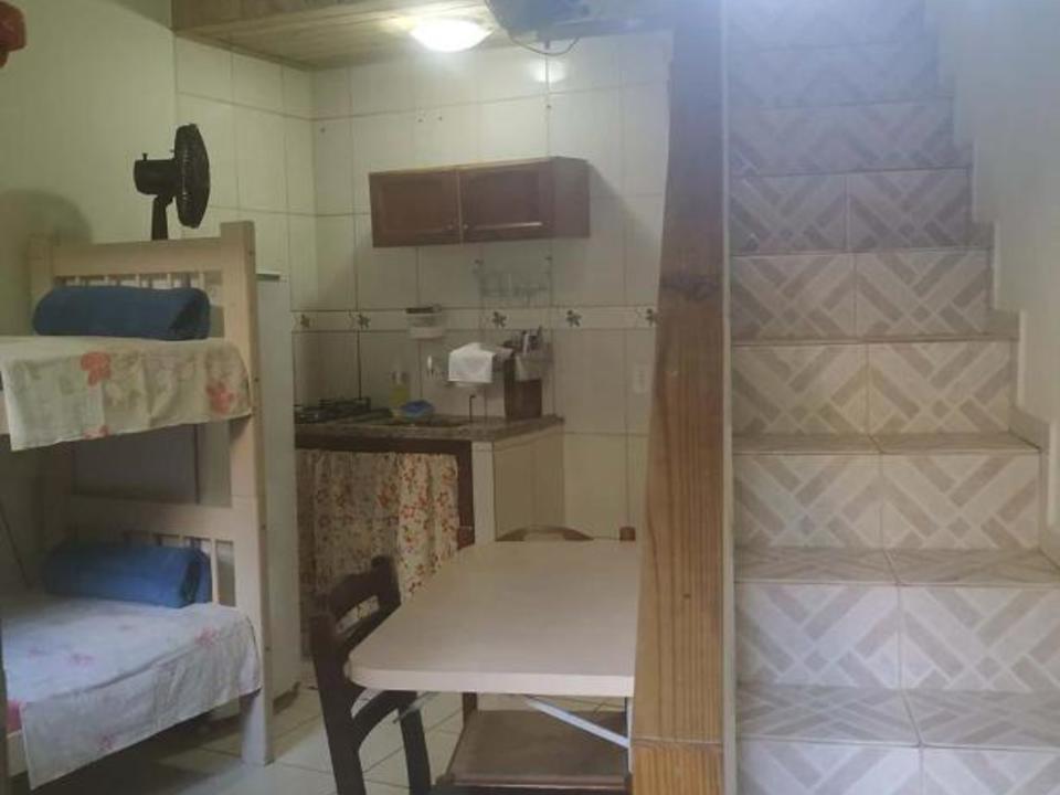 Amplo quarto compartilhado com até 12 pessoas. Com 3 sanitários e 2 chuveiros, Ar condicionado, geladeira e armários com chave. Ao lado de uma cozinha basicamente equipada com fogão e churrasqueira.