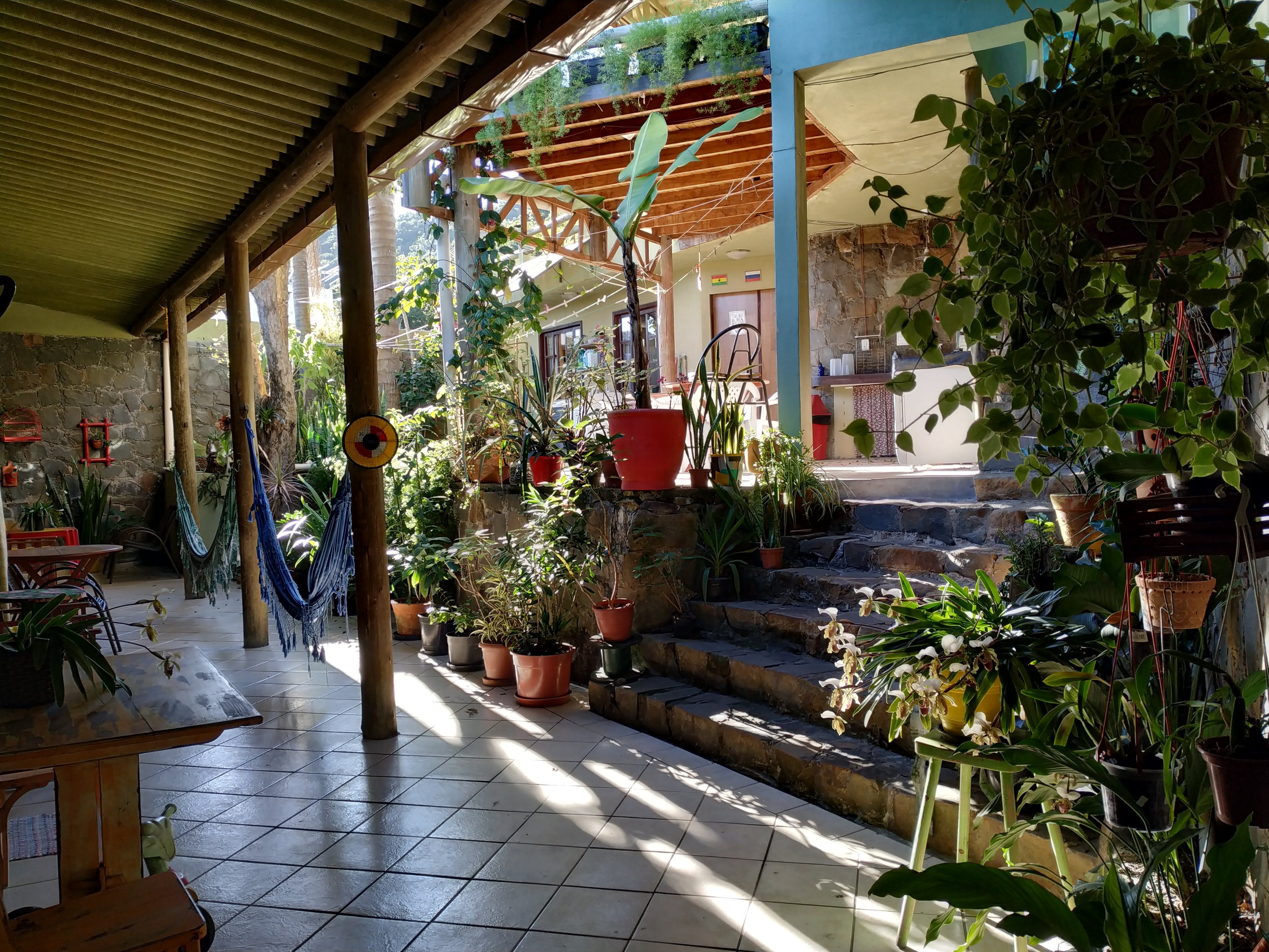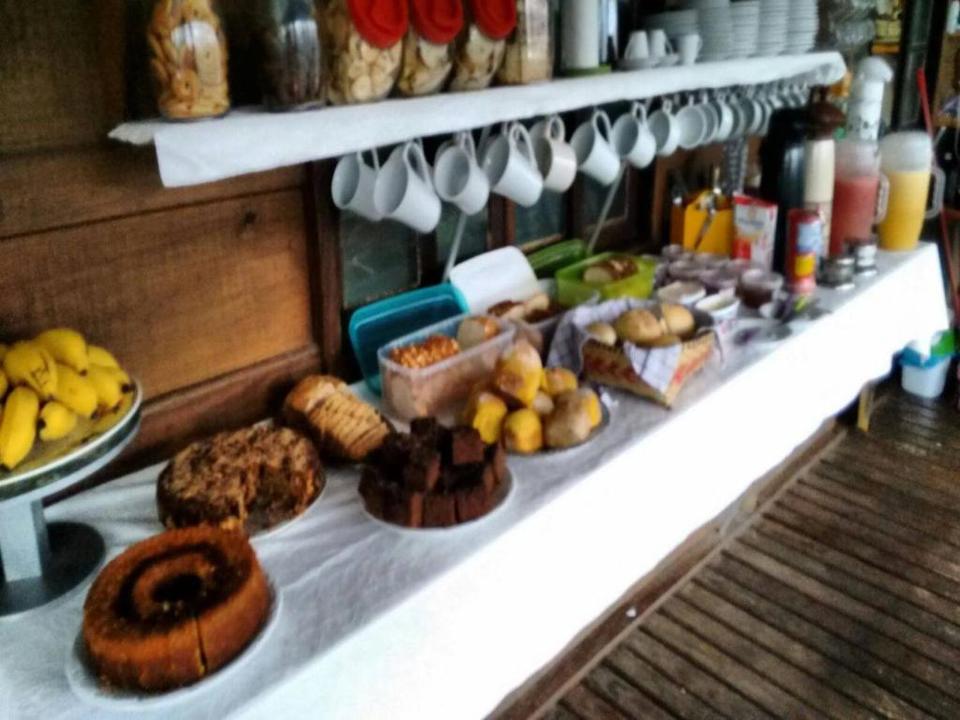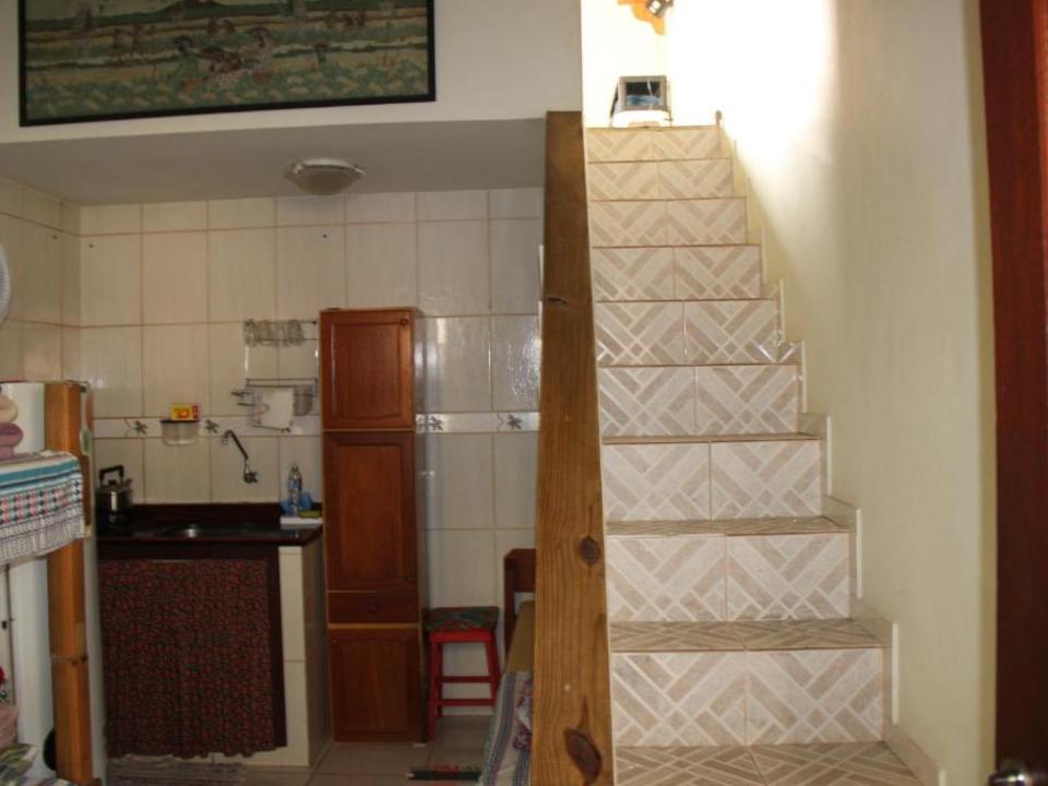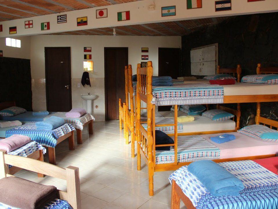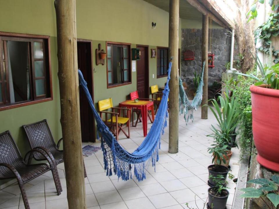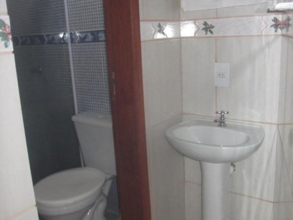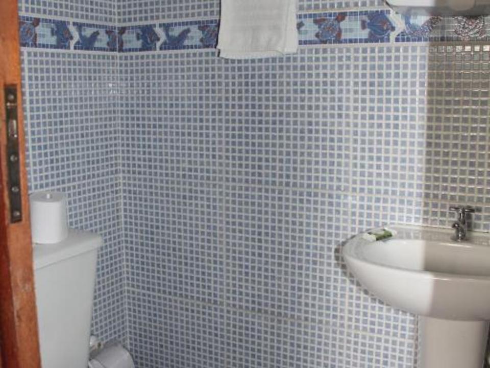 Amplo quarto compartilhado com até 12 pessoas. Com 3 sanitários e 2 chuveiros, Ar condicionado, geladeira e armários com chave. Ao lado de uma cozinha basicamente equipada com fogão e churrasqueira.