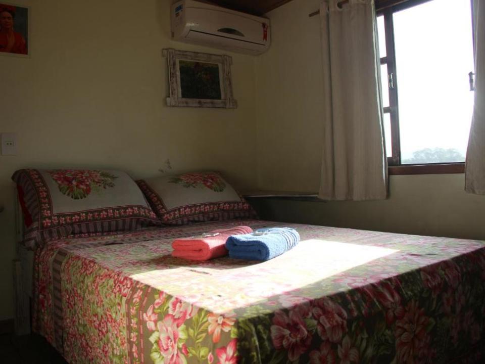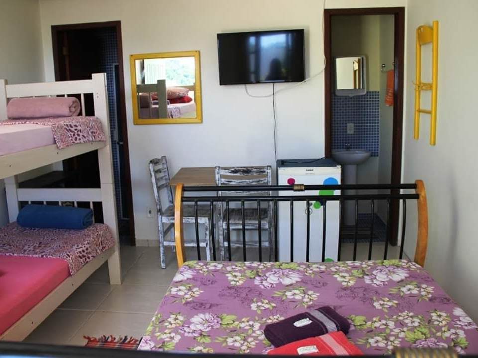 Este quarto grande está equipado com ar-condicionado Split, tv e Geladeira. Possui 3 banheiros sendo 2 chuveiros e 3 sanitários. Com beliches e camas de solteiro, ideal para famílias grandes ou grupo de amigos.